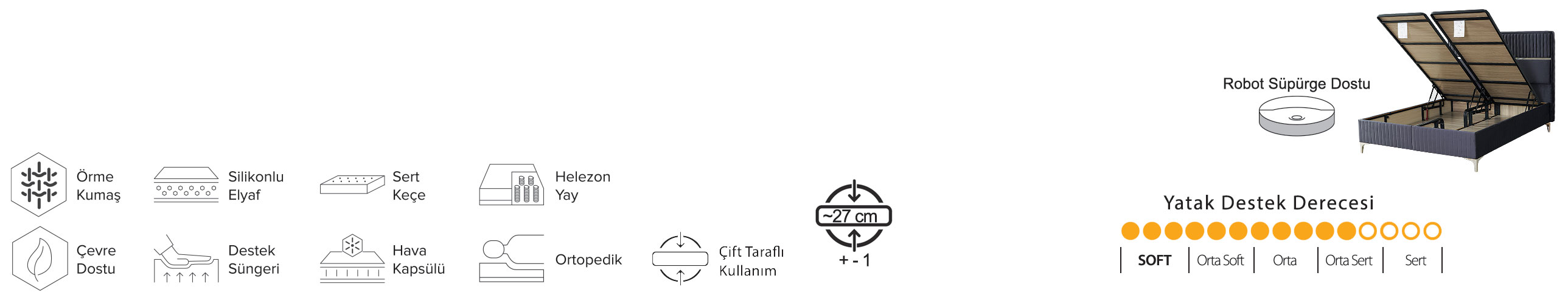 Rahat ve temiz bir yatakta uyumak günün yorgunluğunu ve stresini atmamıza yardımcı olur.Yüksek teknoloji kullanılarak elde edilen orta sert sünger, size ve sevdiklerinize hem temiz hem de çok rahat bir uyku deneyimi sunuyor.
